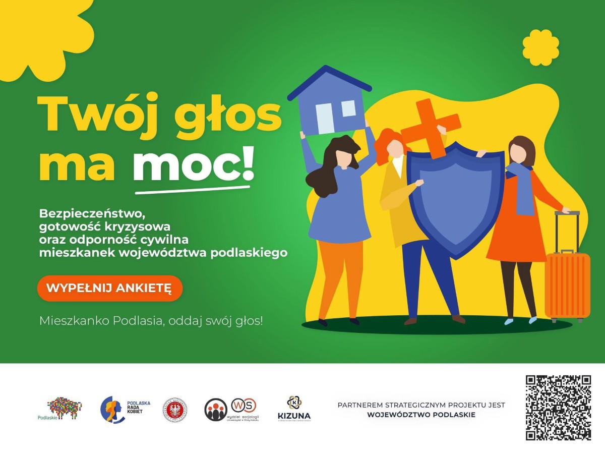 Partnerem strategicznym badania jest Marszałek Województwa Podlaskiego oraz Podlaska Rada Kobiet a jego realizacja odbywa się we współpracy z Wydziałem Socjologii Uniwersytetu w Białymstoku. W imieniu Organizatorów zapraszamy mieszkanki regionu do udziału w anonimowej ankiecie dotyczącej bezpieczeństwa, gotowości kryzysowej oraz odporności cywilnej.